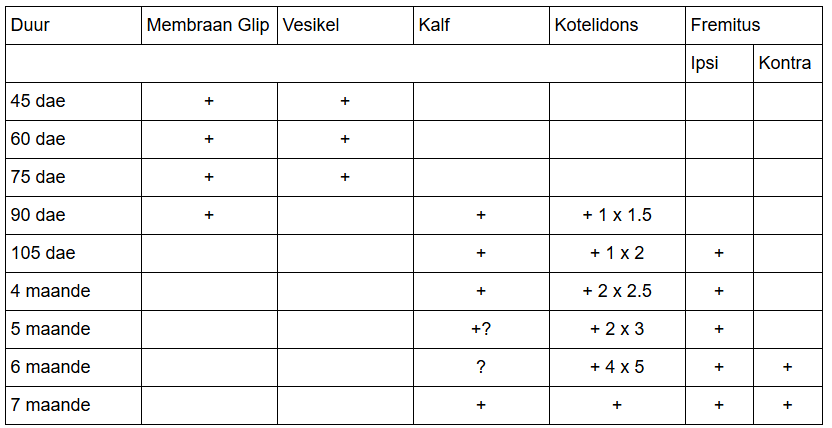 Tabel 3: Positiewe tekens van dragtigheid en fremitus tydens rektale palpasie.